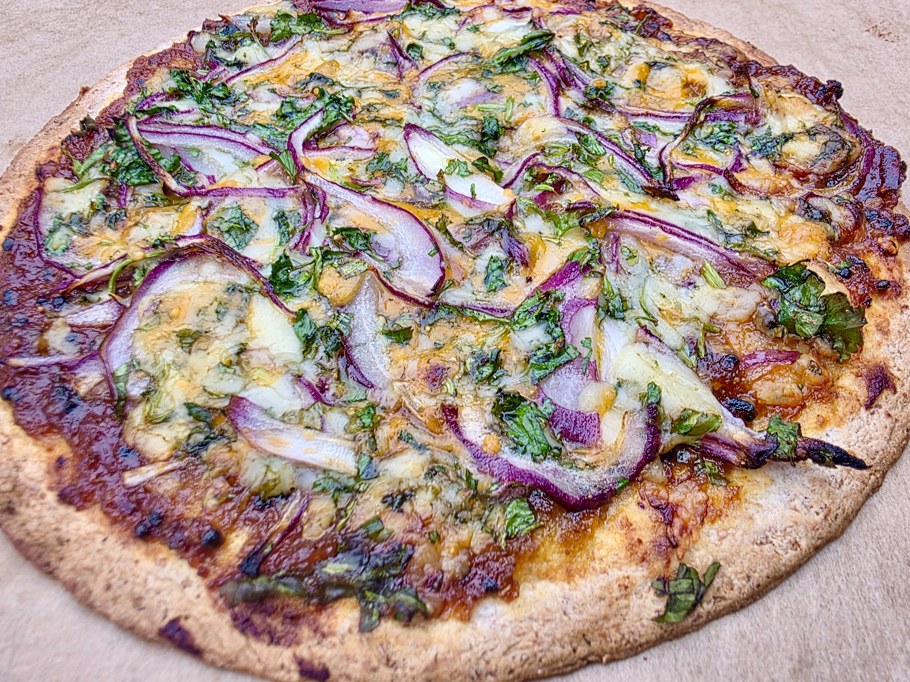 You can use any type of flatbread: naan, roti, soft tortillas….or, of course, good sliced bread. A thicker bread such as naan gives more of a pizza feel, whereas thin flatbreads give tostadas or, when cut, crispy and coated nacho vibes!